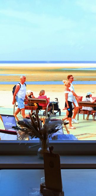 Les spectateurs voient un monde coloré de ciel, de sable et de mer – une scène où les gens deviennent des protagonistes et des figurants. Le mouvement et l’immobilité se fondent : le geste fugace, l’attente aléatoire, figés comme dans un tableau.